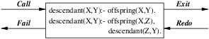 This arrow represents initial invocation of the procedure. When a goal of the form descendant(X,Y) is required to be satisfied, control passes through the Call port of the descendant box with the intention of matching a component clause and then satisfying any subgoals in the body of that clause. Note that this is independent of whether such a match is possible; i.e. first the box is called, and then the attempt to match takes place. Textually we can imagine moving to the code for descendant when meeting a call to descendant in some other part of the code.